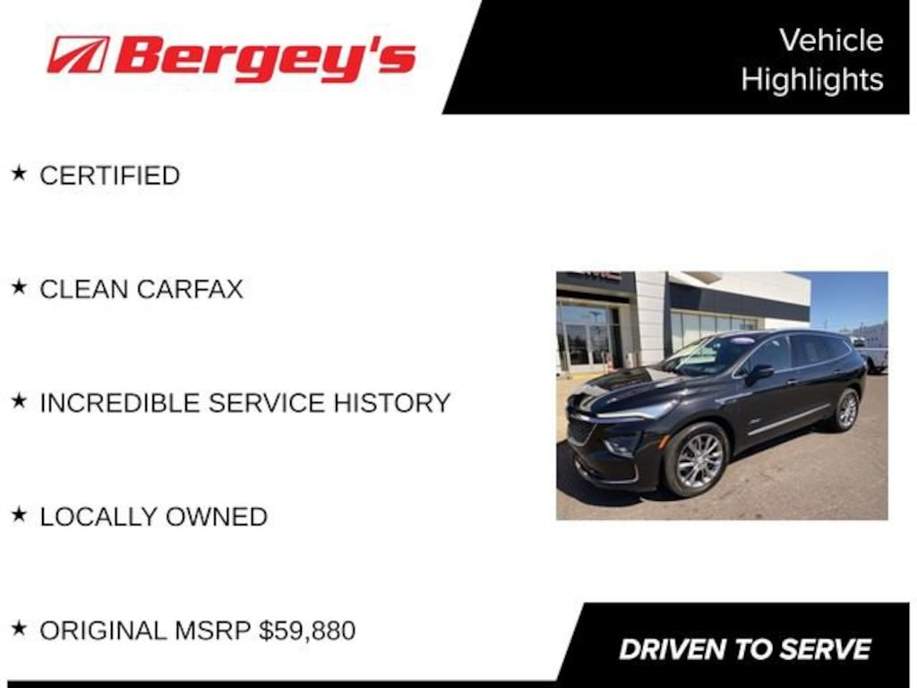 Certified Vehicle!This 2022 Buick Enclave Avenir is a truly exceptional find for the discerning driver. With a clean CARFAX history, incredible service records, and just 49,000 miles, this Buick is a testament to quality, performance, and uncompromising luxury.- CERTIFIED- CLEAN CARFAX- INCREDIBLE SERVICE HISTORY- LOCALLY OWNED- ORIGINAL MSRP $59,880- AVENIR TECHNOLOGY PACKAGE- LICENSE PLATE BRACKET, FRONT MOUNTING PACKAGEPowered by a robust 3.6L V6 engine and paired with a smooth 9-speed automatic transmission, this Enclave Avenir delivers impressive all-wheel-drive capability and an EPA-estimated 25 MPG on the highway. The advanced Avenir Technology Package further enhances the driving experience with premium suspension tuning, hydraulic dampers, and specialized steering calibration.Inside, the Enclave Avenir surrounds you in unparalleled comfort and refinement. Luxurious perforated leather-appointed seats with heating and ventilation keep you relaxed, while the Bose premium audio system and wireless Apple CarPlay/Android Auto integration provide exceptional entertainment. The spacious three-row cabin offers seating for up to seven, with ample room for passengers and cargo alike.Safety and convenience are also hallmarks of this exceptional Enclave. Features like the Heads-Up Display, Front and Rear Park Assist, and comprehensive suite of advanced driver assistance technologies give you peace of mind on every journey. The power liftgate and wireless device charging further elevate the driving experience.With its striking Avenir design cues, this 2022 Buick Enclave is a true head-turner. The bold black exterior, 20-inch alloy wheels, and premium lighting elements create a commanding presence that is sure to turn heads wherever you go.If you're seeking a premium, well-equipped, and meticulously maintained SUV, this 2022 Buick Enclave Avenir is an exceptional choice. We invite you to experience its unparalleled blend of luxury, performance, and technology by scheduling a test drive at our showroom today.