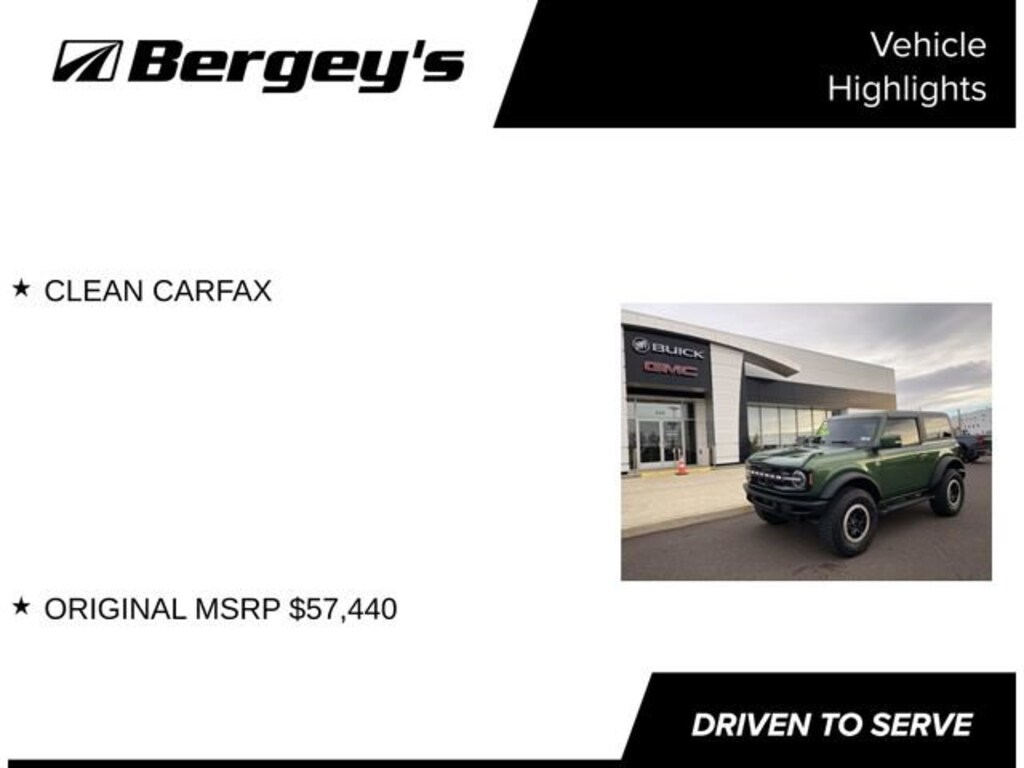 SUPER FUN VEHICLE TO DRIVE AND OWN!! SPORTY BRONCO OUTER BANKS HIGH PKG! ERUPTION GREEN METALLIC W/ROAST/BLACK LEATHER/VINYL SEATS! CLEAN CARFAX! THIS VEHICLE COMES FULLY SERVICED W/NEW PA INSPECTION, OIL CHANGE SERVICE AND A FRESH DETAIL! STILL COVERED UNDER THE FORD FACTORY POWERTRAIN LIMITED WARRANTY! THIS ONE WON'T LAST!!