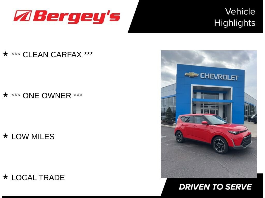 Discover the 2023 Kia Soul EX, a remarkable compact SUV that seamlessly blends style, technology, and performance. With its striking red exterior, this one-owner Soul EX is a true standout on the road, turning heads wherever it goes.- CLEAN CARFAX- ONE OWNER- LOCAL TRADE- LOW MILESUnder the hood, the Soul EX is powered by a 2.0L I4 DOHC engine, delivering a smooth and efficient driving experience with its CVT transmission and front-wheel drive. Boasting an impressive 28 city/33 highway MPG, this Kia Soul EX is designed to keep you on the go without frequent stops at the pump.Stepping inside, you'll be greeted by a wealth of premium features that elevate the driving experience. Enjoy the convenience of Apple CarPlay and Android Auto, keeping you connected and entertained on the road. The Soul EX also offers a navigation system, a panoramic sunroof, and a host of advanced safety technologies, including automatic high-beam headlights and a rearview camera, ensuring your peace of mind behind the wheel.This Kia Soul EX is a certified pre-owned vehicle, meaning it has undergone a rigorous inspection and comes with an extended warranty for your added confidence. With its low mileage and impressive list of features, this Soul EX is the perfect blend of practicality and style, ready to elevate your daily commute or weekend adventures.Imagine yourself behind the wheel of this stunning 2023 Kia Soul EX. Experience the convenience, comfort, and confidence that this compact SUV has to offer. Visit our showroom today and let us demonstrate how this remarkable vehicle can enhance your driving experience.