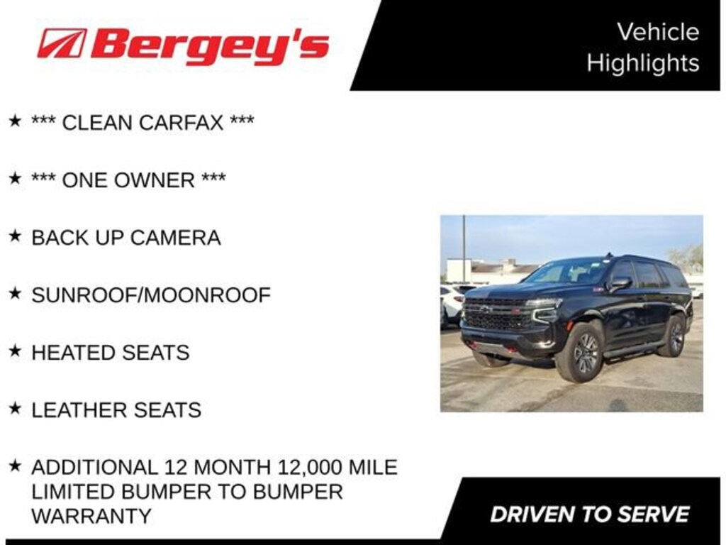 Recent Arrival! *** CLEAN CARFAX ***, *** ONE OWNER ***, BACK UP CAMERA, SUNROOF/MOONROOF, HEATED SEATS, LEATHER SEATS, ADDITIONAL 12 MONTH 12,000 MILE LIMITED BUMPER TO BUMPER WARRANTY, 4WD, Jet Black Leather. Certified. Certification Program Details: *12-Month/12,000-Mile Bumper-to-Bumper Limited Warranty*, whichever comes first, in addition to any remaining original factory Bumper-to-Bumper warranty. See participating dealer and warranty booklet for limited warranty eligibility and coverage details, including limitations and exclusions. *Except for non-GM vehicles in the State of California, where coverage will be provided by a vehicle service contract. Odometer is 24757 miles below market average!Awards:* JD Power Automotive Performance, Execution and Layout (APEAL) Study * ALG Residual Value2021 Black Chevrolet Tahoe 4WD EcoTec3 5.3L V8 10-Speed Automatic with Overdrive